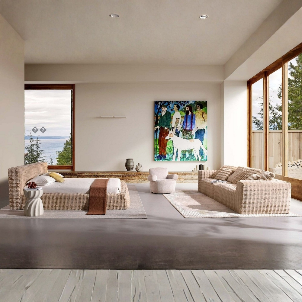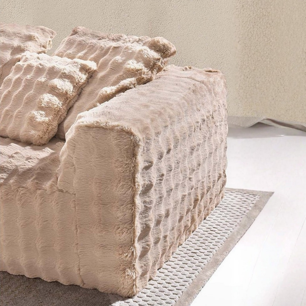 Upholstered in a textured, breathable fabric in warm neutral tones, it blends effortlessly into contemporary, Japandi, and Scandinavian interiors. The deep seat depth and generous proportions provide exceptional comfort for lounging, relaxing, or casual sleeping. Its modular construction allows flexible arrangement to suit various room layouts, making it ideal for open-plan spaces.
